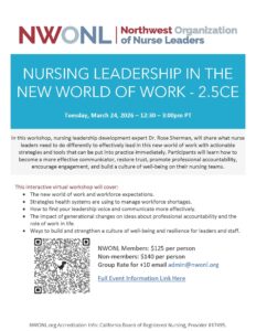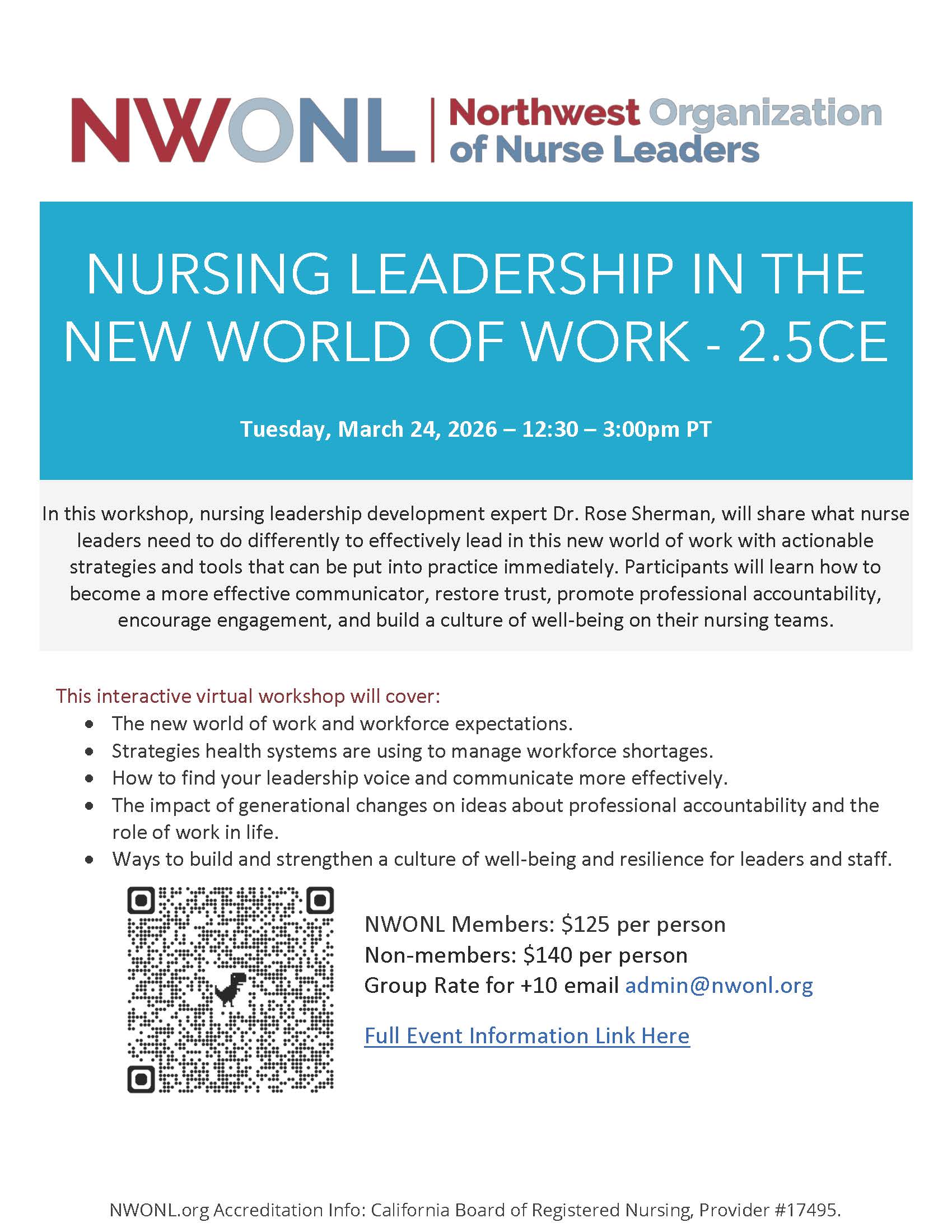 I am excited to partner with the NW ONL chapter to offer this important workshop on Nursing Leadership in the New World of Work to nurse leaders nationally. In this highly interactive session, we will discuss what is happening in our healthcare environment and the new tools and strategies nurse leaders need to future-proof their leadership. These programs are excellent to watch as a leadership team, where you follow the workshop with specific discussion about strategic steps you may want to take in your own environment. I am always happy to pre-test your conference room to ensure it works seamlessly on the day of programming. Register here